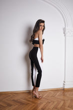• Design modern și feminin: Bustiera neagră, cu tăietură asimetrică, pune în evidență silueta, în timp ce linia pantalonului alb adaugă un contrast elegant.
