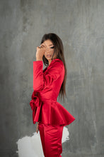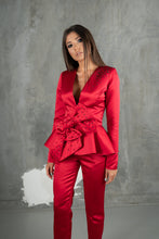 Strălucește într-o apariție spectaculoasă cu acest set elegant format din sacou cu design asimetric și pantaloni slim-fit, realizat într-o nuanță vibrantă de roșu aprins. Detaliile rafinate, precum aplicațiile strălucitoare și funda supradimensionată , conferă un aer indraznet si exclusivist, perfect pentru evenimente de gală sau ocazii speciale.