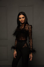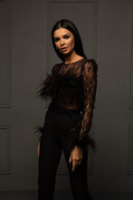 Compleul este format din bluza din dantela frantuzeasca cu pene de strut aplicate si pantalon cu insertii de dantela pentru completarea unui look fabulos