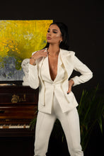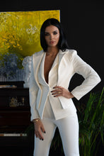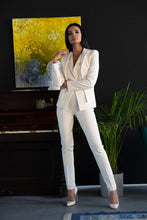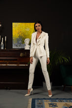 Sacoul reinterpretat, cu un croi special, ofera un styling aparte. Linii fine, accentuate de cusaturi negre pentru evidentierea lor, continuand pe dunga pantalonului.