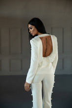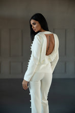 Costumul este realizat din material ivory cu structura eleganta si urmareste linia corpului printr-o croiala ajustata care defineste silueta. Setul este compus din sacou cambrat si pantaloni drepti, iar designul este evidentiat de aplicatiile decorative din perle dispuse pe partea frontala a sacoului si de-a lungul liniei laterale a pantalonilor. Spatele sacoului este decupat si completat de un drapaj discret in zona taliei.