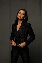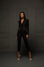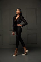 Costum realizat din stofa cu aspect satinat si este compus din sacou cambrat si pantaloni conici care urmaresc linia corpului si evidentiaza silueta. Sacoul are rever clasic si decolteu in V, fiind accentuat de cusaturi decorative contrastante care contureaza subtil zona bustului si a taliei. Pantalonii au talie inalta si croiala slim, cu linii curate care alungesc vizual silueta.