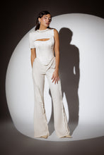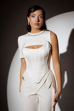 Top cu design contemporan, evidențiat de un corset aplicat care conturează talia și oferă un efect sculptural siluetei. Decupajul frontal adaugă un accent modern și evidențiază linia bustului.