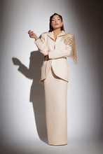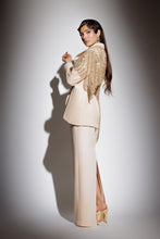 Compleu format din sacou cu rever ascutit, croiala structurata si inchidere frontala. Aplicatie decorativa ampla pe umar, realizata din broderie cu margele si elemente stralucitoare care continua pe spate. Fusta lunga cu croiala dreapta si slit posterior pentru libertate de miscare.