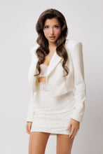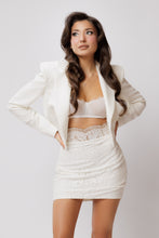 Compleu din doua piese compus din sacou scurt cu umeri structurati si fusta mini cu talie inalta. Sacoul are croiala moderna cu rever amplu si textura discreta, completand armonios fusta din dantela cu croiala dreapta. Zona taliei este accentuata de o banda de dantela cu margine decorativa, care adauga un detaliu feminin si rafinat.