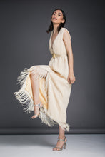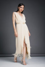 Această rochie midi cu franjuri delicate redefinește eleganța simplă, oferind un design atemporal cu un aer modern. Fabricată dintr-un material texturat în nuanțe aurii și completată de o curea subtilă care accentuează talia, această piesă este ideală pentru evenimentele unde dorești să atragi toate privirile. Franjurile fine, care se mișcă grațios, adaugă un dinamism aparte, conferind un efect spectaculos fiecărui pas.