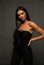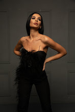 Costum format din corset cu pene aplicate si accesriu pretios,si pantaloni cu pene aplicate