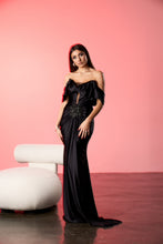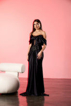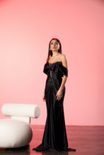 Rochie lunga realizata din satin cu textura fluida, conceputa pentru a evidentia silueta prin drapaje elegante si un design sofisticat al bustului. Rochia are bust off-shoulder cu drapaj amplu si insertie discreta din plasa in zona decolteului. Talia este accentuata printr-un detaliu aplicat tip bijuterie, din care pornesc pliuri fine ce definesc linia rochiei si continua intr-o fusta lunga, fluida.