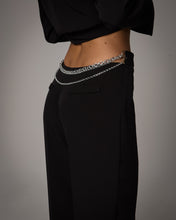 Pantaloni cu talie joasa si croiala lejera, care creeaza o linie relaxata si contemporana. Designul este completat de buzunare discrete si de detaliul metalic cu lanturi aplicate in talie, element care adauga un accent modern piesei.