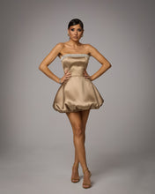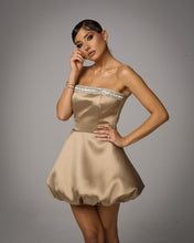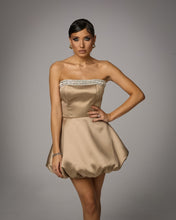 Rochie mini fara bretele, care evidentiaza linia bustului si a taliei. Partea inferioara este ampla, cu volum accentuat si tiv tip balon, care creeaza o silueta feminina si bine definita. Linia bustului este decorata cu aplicatii cu strasuri, care adauga un accent elegant piesei. Textura satinata completeaza aspectul rafinat al rochiei si pune in valoare culoarea bej.