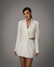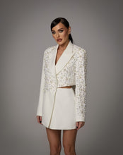 Compleul este realizat din doua piese si include un sacou cropped cu rever clasic si o fusta mini cu linie structurata. Designul este pus in valoare de aplicatii cu perle cusute manual, de diferite dimensiuni dispuse pe umeri, piept si maneci, care adauga textura si un accent elegant intregului compleu.