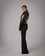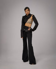 Setul este compus din pantaloni lungi cu croiala evazata si un top asimetric cu maneca lunga. Topul include un panou decorativ brodat cu aplicatii aurii si un decupaj lateral care evidentiaza linia taliei. Spatele este deschis si prevazut cu inchidere cu siret pentru ajustare. Pantalonii au o linie alungita si structurata, care completeaza silueta eleganta a setului.
