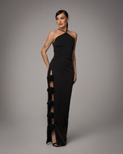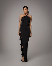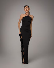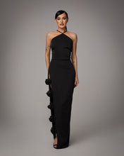 Rochie lunga cu croiala eleganta, decolteu halter si linie alungita care urmareste silueta. Designul este accentuat de un decupaj lateral amplu, decorat cu aplicatii florale tridimensionale dispuse pe intreaga lungime din talie pana jos, care adauga volum si un contrast subtil de textura.