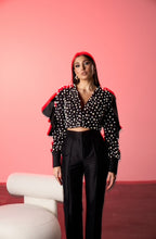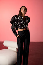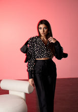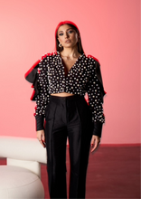 Sacoul Pearl Éclat are o croiala structurata si un decolteu adanc, evidentiind linia umerilor prin volane ample. Suprafata piesei este decorata cu perle aplicate de diferite dimensiuni, care creeaza un efect texturat si elegant, transformand sacoul intr-o piesa statement.