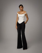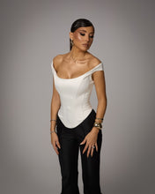 Corsetul are o croiala structurata care evidentiaza talia si contureaza silueta intr-o forma eleganta si definita. Designul off-shoulder lasa umerii descoperiti si pune in valoare linia decolteului, iar partea inferioara usor ascutita accentueaza talia si creeaza un efect sculptural. Liniile curate si constructia ferma ofera un echilibru intre rafinament si modernitate.