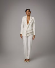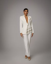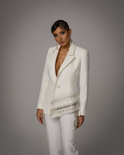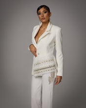 Costumul este compus din sacou cu rever clasic si pantaloni cu croiala dreapta cu detalii stralucitoare, realizate din material structurat care pastreaza linia eleganta a siluetei. Designul este accentuat de o aplicatie decorativa texturata plasata pe partea laterala a sacoului, realizata din straturi de cristale si franjuri fine, care adauga miscare si un accent sofisticat intregului ansamblu.