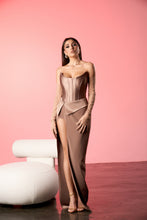 Rochie lunga realizata din satin cu textura, conceputa pentru a evidentia silueta printr-un corset structurat si o croiala eleganta. Rochia are bust tip corset cu cusaturi verticale care structureaza partea superioara si sustin forma decolteului. Partea inferioara este realizata din satin fluid, cu slit frontal si detaliu drapat in talie, fixat lateral printr-o aplicatie discreta.